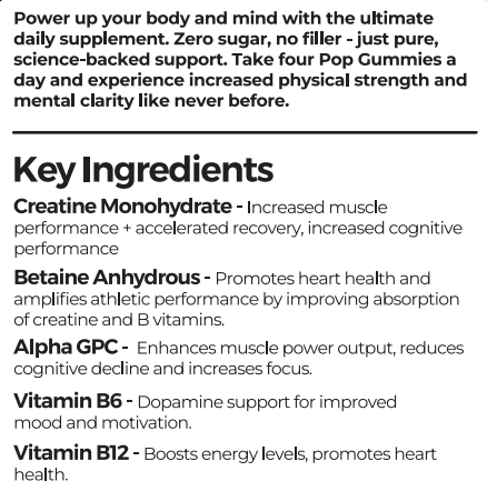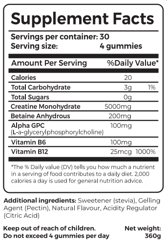 Monthly Supply - 4 gummies per day provides your daily dose of Creatine, Vitamin-B complex and Alpha GPC.